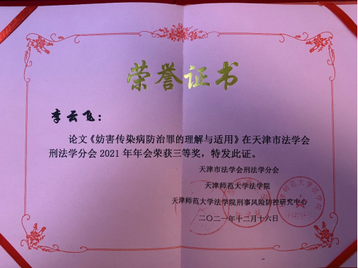 年会组委会组织优秀论文评选活动,开云kaiyun官网研究生踊跃参与年会征文,其中2020级硕士研究生李云飞同学的参会论文《妨害传染病防治罪的理解与适用》获本次年会优秀论文三等奖。